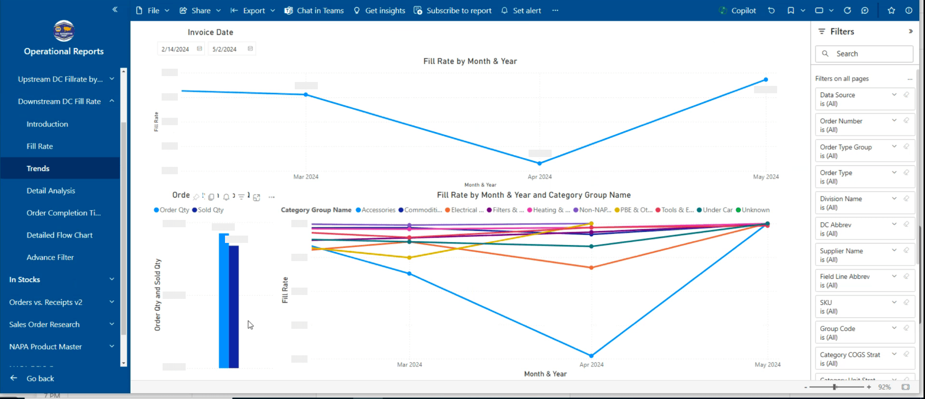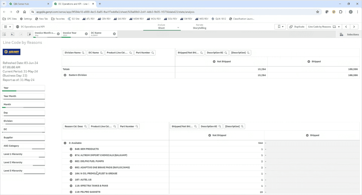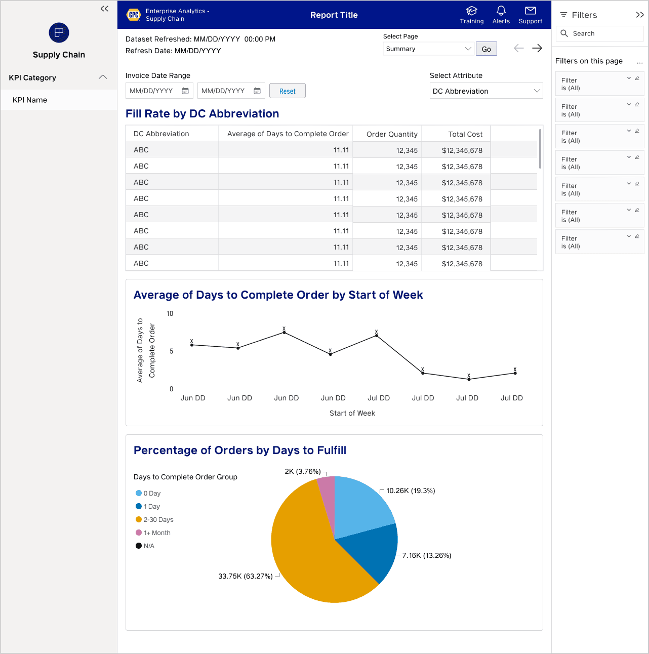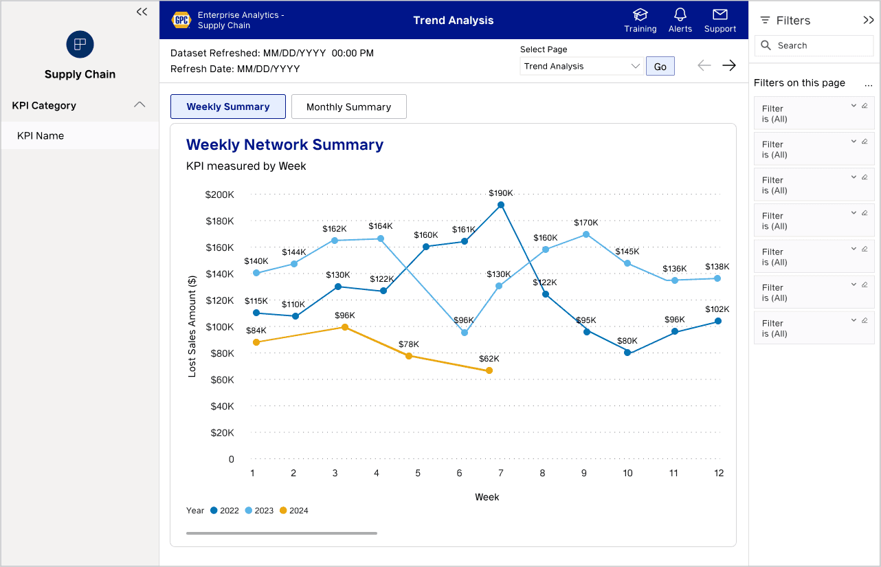 These are some of the use cases I designed for with enterprise dashboards that help Supply Chain leaders analyze data across 53 Distribution Centers, supplying inventory to 6,000+ NAPA Auto Parts stores, other warehouses, and commercial clients like airlines and fleet operators.