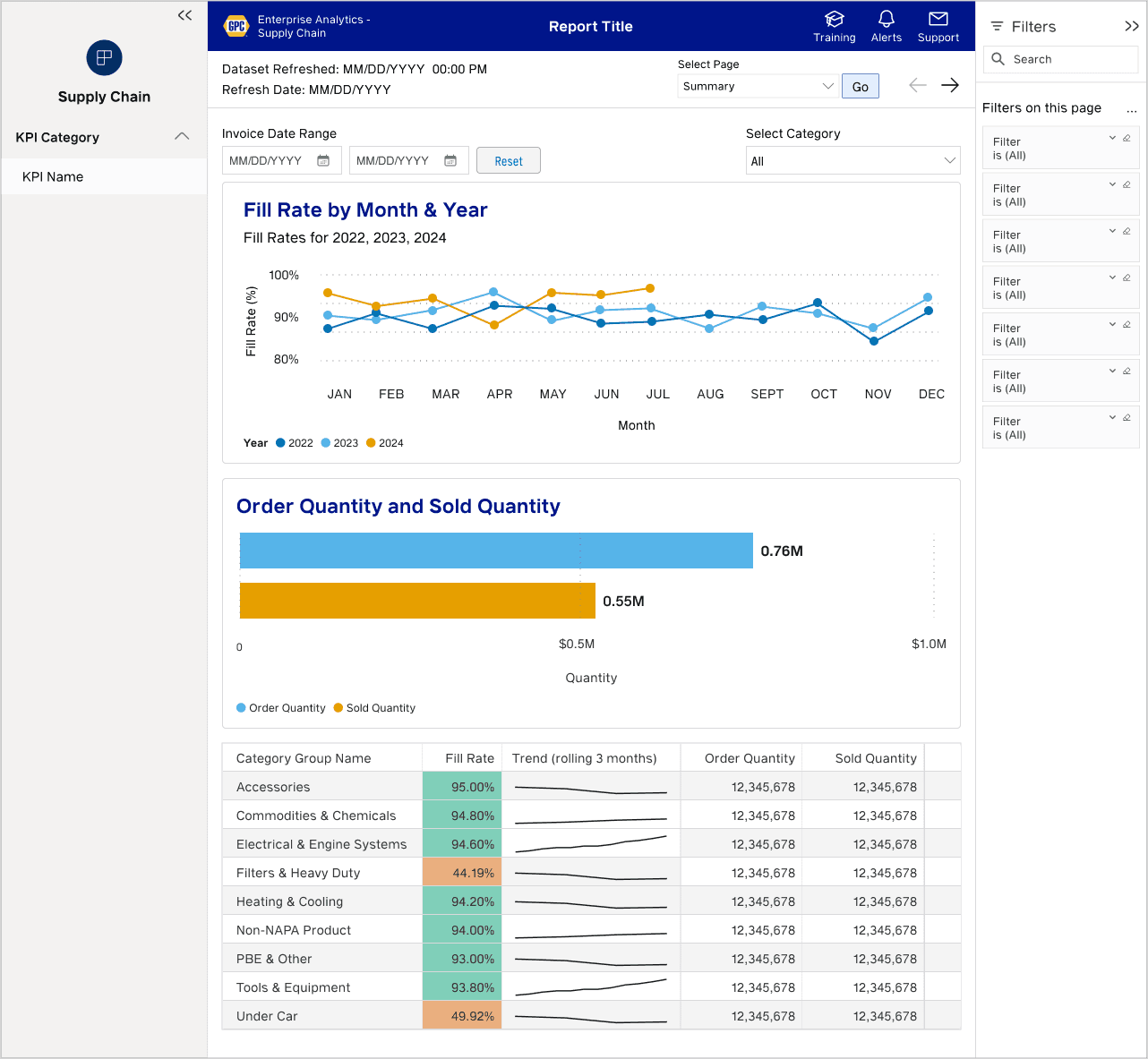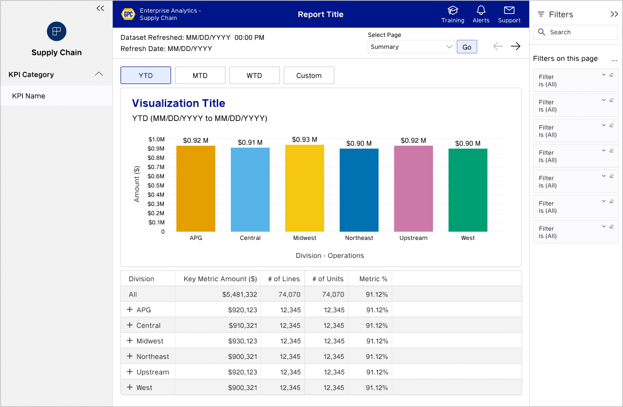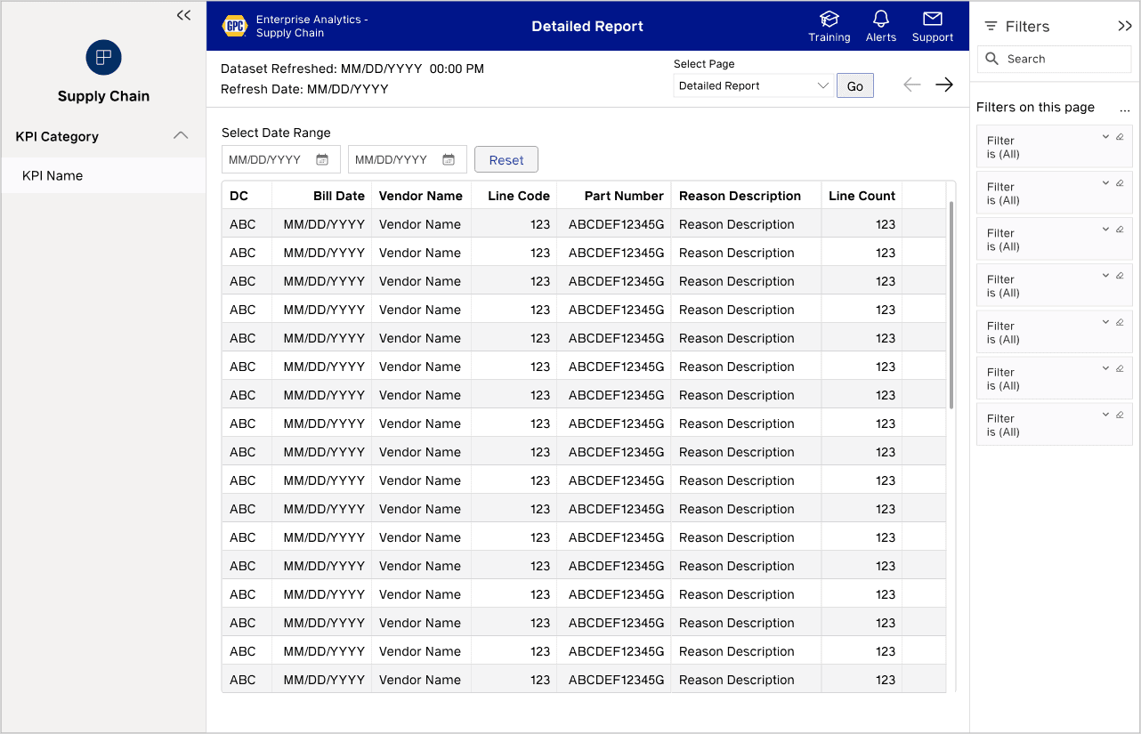 I created design standards and reusable components that developers use to build reports for teams like Sales, HR, Pricing, and Finance. These reports, built in Power BI and updated daily via Google BigQuery, support Genuine Parts Company's modern data strategy.
