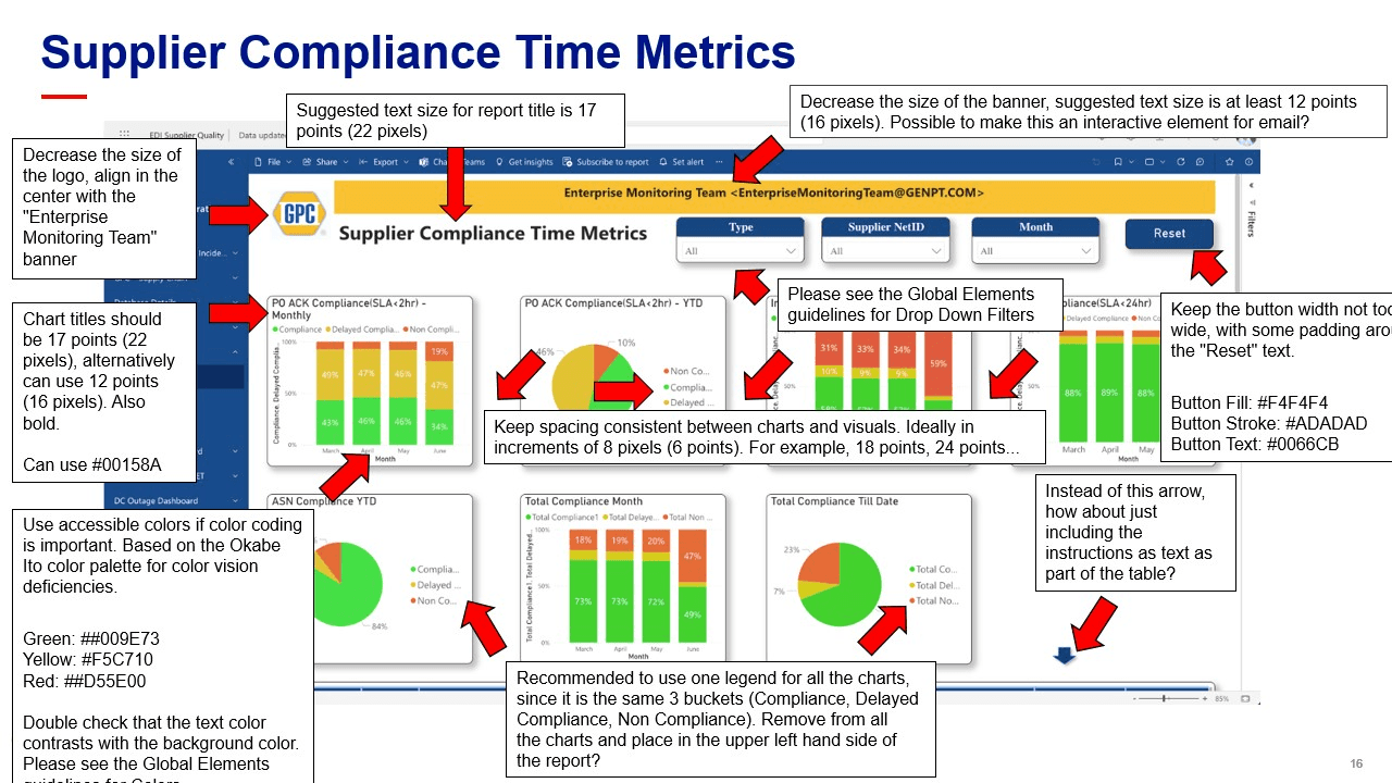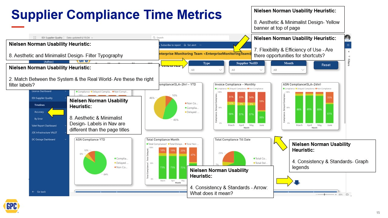 I also conducted heuristic analyses of dashboards for other initiatives, recommending improvements based on our enterprise standards and Nielsen Norman Usability Heuristics, with direct updates in Power BI.